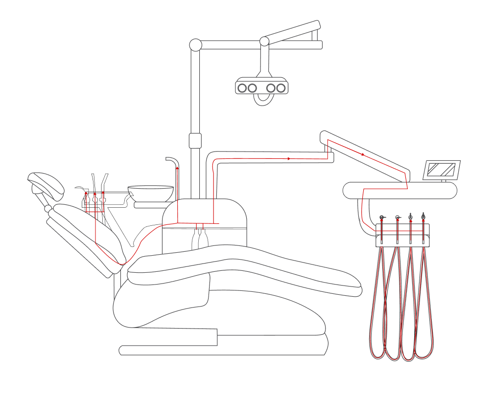 Дезинфицирующее средство можно использовать для дезинфекции всех шлангов, включая шланги блока врача, пылесос и слюноотсос.